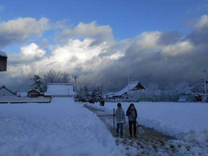 児童が登校してくると、5年生6年生が前庭や交通公園をきれいに除雪しました。