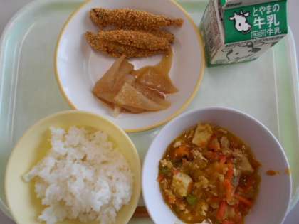 今日の献立は、ご飯、牛乳、きびなごのサクサク揚げ、こんにゃくのゆず味噌和え、冬至のそぼろあんです。来週月曜日の献立は、ご飯、牛乳、千草焼き、れんこんのきんぴら、すりみ汁、納豆、あいかです。