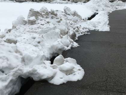 下の写真のように、除雪の際にできた雪山が、校区内や学校敷地内にたくさんあります。そこで、2点注意!!