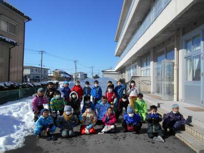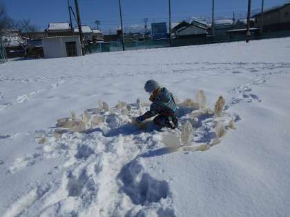 昨年は暖冬で雪遊びができませんでしたが、今年は大雪。念願の雪遊びができました。そり遊びをしたり、分厚い氷を集めて氷屋さんを作ったり、かまくら作りに挑戦したり、沈まないように歩く方法を見つけようとしたり、雪遊びを思う存分楽しみました!