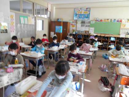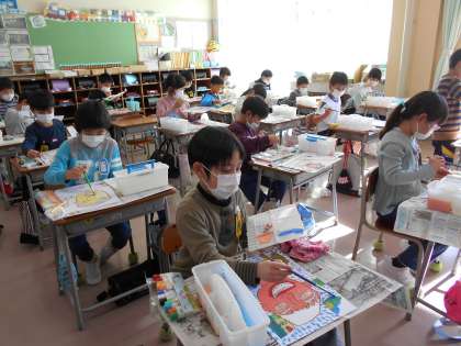 図画工作科の時間に大好きな家族の絵を描いています。水彩セットの使い方も慣れてきました。水の量を調節しながら、表したい様子になるように工夫して描いていました。