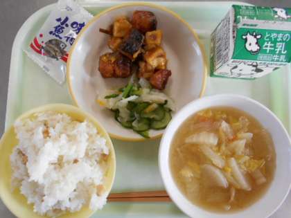 今日の献立は、ほっぺたおとしの豆ご飯、牛乳、ブリと高野豆腐の香味ソース、すずなのゆず和え、ゆうすげ村の具沢山汁です。明日の献立は、ご飯、牛乳、鯖の味噌煮、ごま和え、侍のおでん、みかんです。