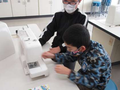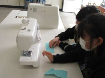 今日は、初めてミシン縫いに挑戦しました。針を付ける練習をしたり、から縫いをしたりして使い方を確かめました。友達と協力をしながら練習に取り組んでいました。