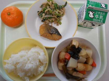 今日の献立は、ご飯、牛乳、鯖の味噌煮、ごま和え、侍のおでん、みかんです。明日の献立は、コッペパン、牛乳、ぐりとぐらのハートオムレツ、森のきのこソテー、栗のクリーム煮、かぼちゃマフィンです。