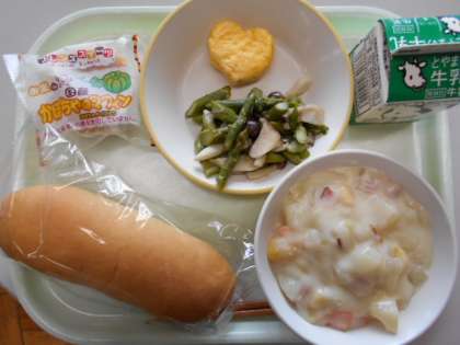 今日の献立は、コッペパン、牛乳、ぐりとぐらのハートオムレツ、森のキノコソテー、栗のクリーム煮、かぼちゃマフィンです。明日の献立は、ご飯、牛乳、キャベツくんと、とんかつくん、ミニトマト、ブタヤマさんの団子汁、月夜のゼリーです。