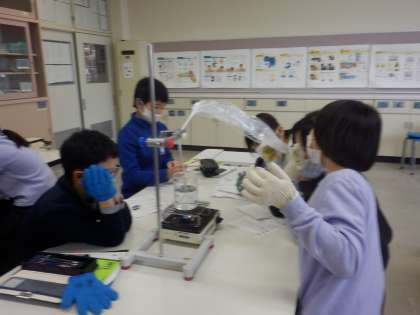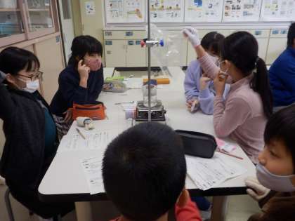 湯気をスプーンに付けてみたり、漏斗で沸騰した泡を集めて袋にためてみたり。水の温度が上がっていくにつれて、いろいろな変化がみられます。
