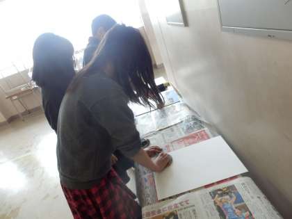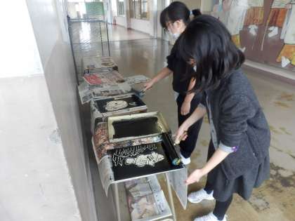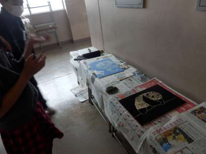 実際に白黒になると、どんなふうに見えるのかお試しで刷ってみました。板で見ているよりも意外と真っ黒にうつったり、彫った線がうまく出なかったりと意外とイメージと違っていたようです。