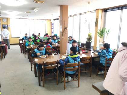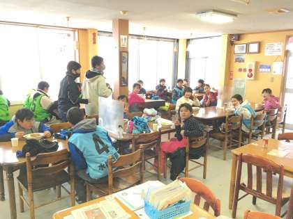 前半組が昼食をとります。感染症対策で間隔を開けて食べています。