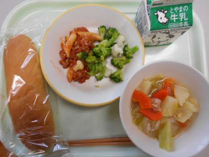 今日の献立は、コッペパン、牛乳、ペンネのミートソース、添え野菜、ポトフです。明日の献立は、ご飯、牛乳、小イワシの天ぷら、昆布和え、こんこんじる、いよかんです。