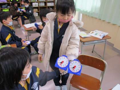 算数の時間に、時計の読み方の学習をしました。針を動かして時間を合わせたり、友達と問題を出し合ったりして、楽しく学習していました。やさしく教え合える子供たちです。