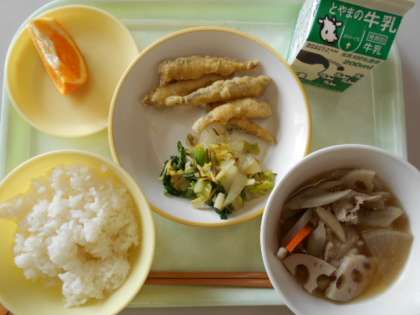 今日の献立は、ご飯、牛乳、小イワシの天ぷら、昆布和え、こんこん汁です。来週月曜日の献立は、選択献立です。ご飯、牛乳、魚の甘味噌かけ、もしくは肉じゃがコロッケ、ビーンズサラダ、春雨スープ、りんごタルトもしくはチョコプリンです。