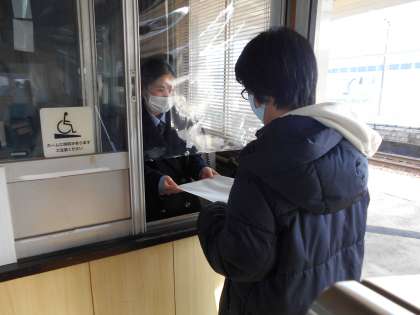 まずは、水橋駅に行きました。児童代表のSさんは、駅員さんにとても上手に話をしていました。駅員さんに、快く受け取っていただきました。