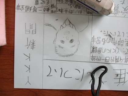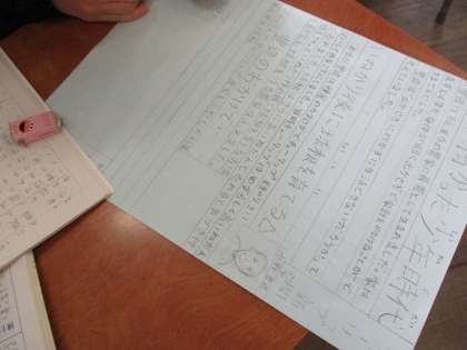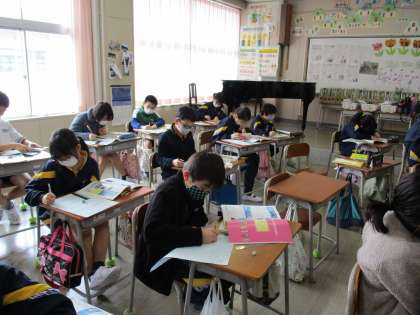 社会は、富山県の偉人について調べ、新聞にしています。似顔絵を描いている子もたくさんです。