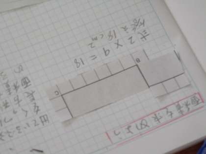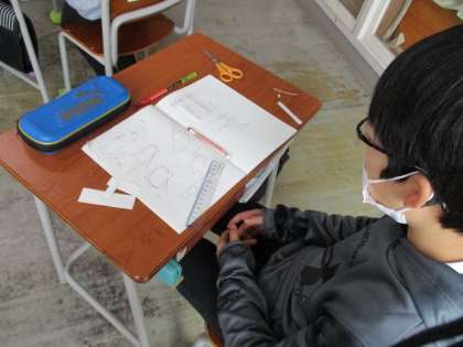 そして今日は、長方形や正方形ではない形の面積の求め方を考えました。これまでの学習を思い出し、区切ってみたり、変形させてみたりなどなど、工夫をして求めていました。「どうしようか・・・」と少し遠くから見てみると、違った方法が見えてくることもあります。じっくり考え、とりあえずやってみるのがいいですね。