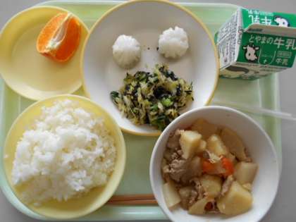 今日の献立は、ご飯、牛乳、えびパオツ、磯和え、じゃがいもの中華煮、かんぺいです。来週月曜日の献立は、ご飯、牛乳、豚肉の梅ソースかけ、枝豆サラダ、鮭の米粉シチューです。