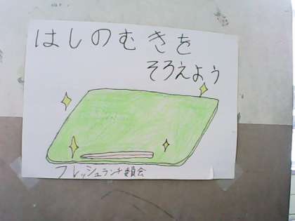 1年1組と生活科室の間にいるよ。目がキラキラしていておもしろいよ。口はあけないよ。
