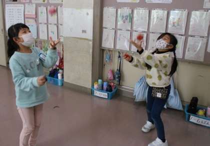 今日は、生活科でこま回し、けん玉、ヨーヨー、お手玉を楽しみました。こまには、自分で色をぬったり、模様を描いたりして、オリジナルのこまを完成しました。