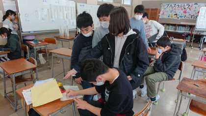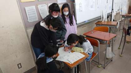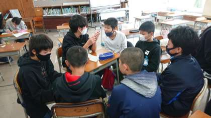 今日は、水橋東部小、水橋中部小、水橋西部小の3校合同で、6年生の交流を行いました。学級の良さやこれまでの思い出を紹介します。他校の6年生にも分かってもらえるように、準備する子供たちです。