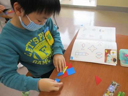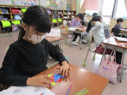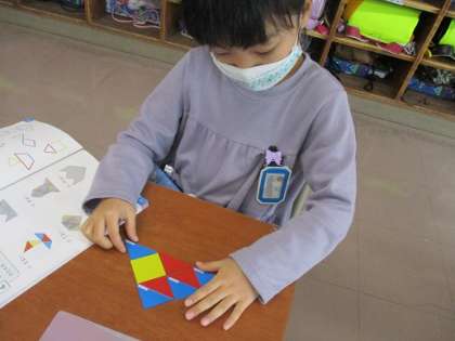 算数の学習では、形作りの学習に取り組んでいます。今日は、決められた数の色板を使って、教科書に出てきた様々な形を作りました。友達と教え合ったり、黙々と色板を操作したりしながら、楽しく活動していました。