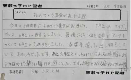 天瀬っ子HP記者 5年生 「卒業おめでとう集会」