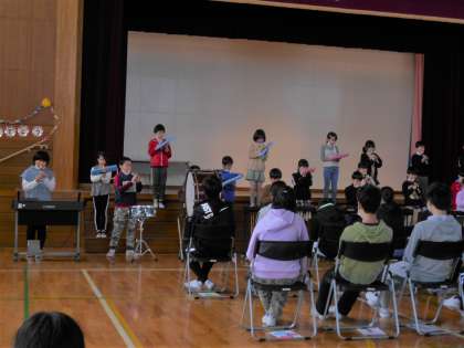 3年生は合奏で、6年生の卒業をお祝いしました。「パフ」「ミッキーマウスのテーマ」の2曲をきれいな音色で演奏しました。息がぴったり合っていて6年生は聴き入っていました。