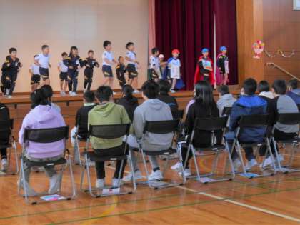 2年生は「おめでとうレンジャー」が登場し、おめでとうの気持ちを精一杯伝えました。ダンスもとてもすてきで、6年生はニコニコして見ていました。一緒に踊っている6年生もいました。