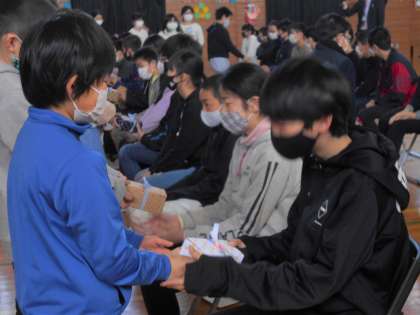 4年生は、とってもきれいな箱をプレゼントしました。この箱、実は・・・「びっくり箱」で、6年生は箱を開けてびっくり、大喜び。