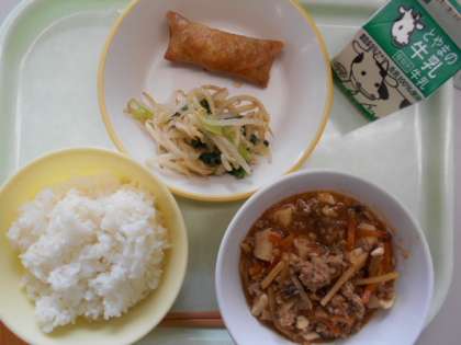 今日の献立は、ご飯、牛乳、春巻き、ナムル、マーボー豆腐です。明日の献立は、コッペパン、牛乳、鶏肉のバーベキューソース味、花野菜サラダ、白インゲン豆のシチュー、清美オレンジです。