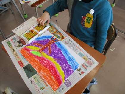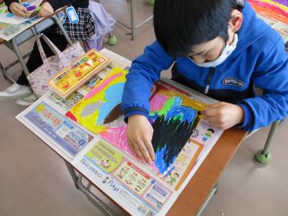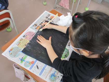 2年生は、シール版画を終えた人から、クレヨンでの表現遊びを楽しみました。「きれいな色を黒で塗りつぶすなんて、緊張する!」と言いながら、手を真っ黒にして力一杯色塗りをしました。真っ黒にした後、模様を描き、きれいな色が出てきて、「わあ、きれい!何の絵を描こうかな!」「もう一枚やりたい!」と、意欲的に活動しました。