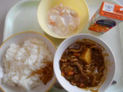 今日の献立は、カレーライス(ご飯)、オレンジジュース、フルーツヨーグルト、福神漬けです。来週、月曜日の献立は、ご飯、牛乳、サンマのマーマレード煮、切り干し大根のオイスターソース炒め、卵とじ、バナナです。