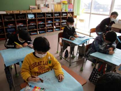 好きな生き物、学習発表会の「アマーセ王国」、国語の教科書で学習した物語の絵などを描いていました!子供たちは、大きな袋にのびのびと表現することを、思う存分楽しんでいました。