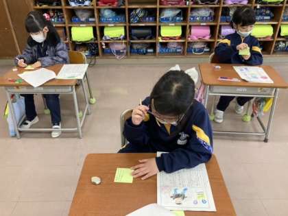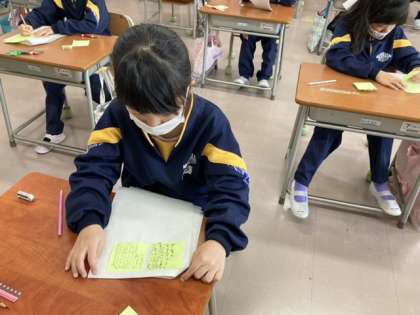 国語科「いいこといっぱい一年生」の学習で書いた文章を友達と読み合いました。黙々と文章を読み、付箋に感想を書いていました。