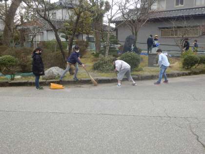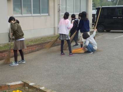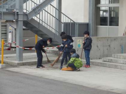 卒業式に向けて、朝から前庭の清掃をした4年生です。砂や落ち葉など隅々まで掃除しました。働き者の4年生です。あっという間にきれいになりました。