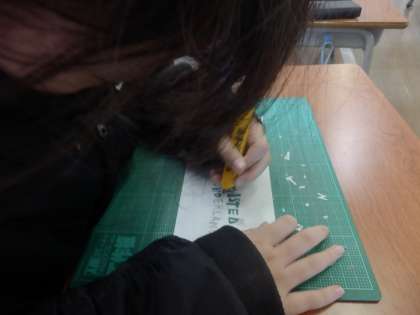 サンドブラストといってグラスに模様をうつします。大変なのは、カッターで切るところと、機会で削るところです。大変な作業でしたがきれいにつくれてよかったです。意外におもしろかったです。