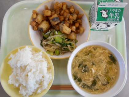 今日の献立は、ご飯、牛乳、魚と豆のえごま味噌からめ、おひたし、かき玉汁です。明日の献立は、ご飯、牛乳、魚の利休揚げ、ひじきの炒め煮、味噌汁、清美オレンジです。