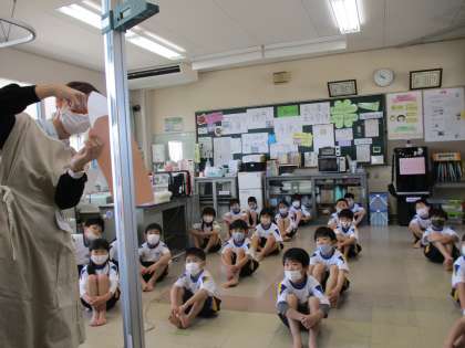 小学校で初めての身体測定です。保健室の先生から、爪が長いとどんな困ることがあるかを聞かれ、よく考えて、たくさん発表していました。