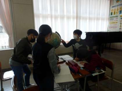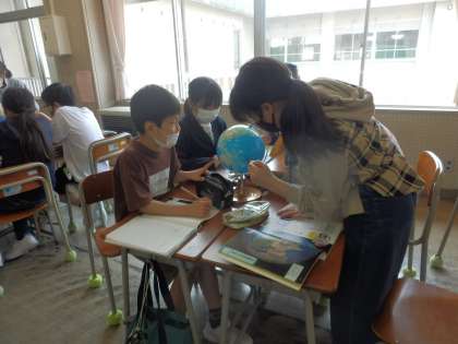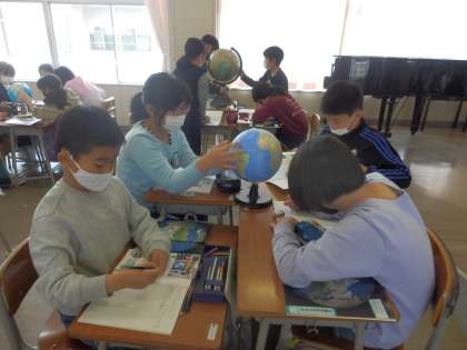 4年の社会では、自分の身近な県や市、文化について学習しましたが、5年生は日本のことについて学習していきます。今日はまず、地球儀を使って日本を見てみたり、日本の近くにある国、遠くにある国を見てみたりしました。