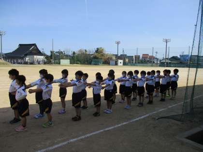 今日は、グラウンドで並び方や走り方の学習をしました。初めての体育で、もっともっと運動したいと思ったようでした。