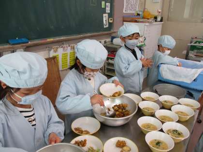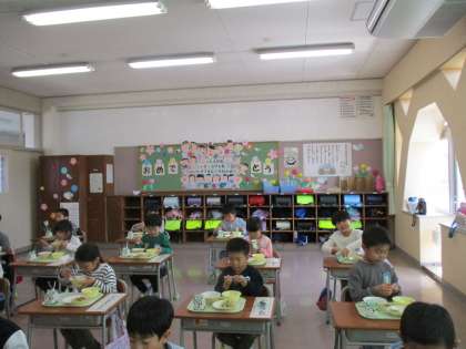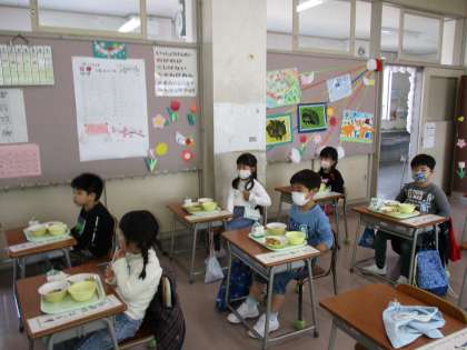 給食当番もがんばっています。こぼさないように丁寧によそっています。配ぜんした後も静かに待っています。もちろん食べるときもとても静かです。1年生もコロナ対策が必要な事をよく理解しています。