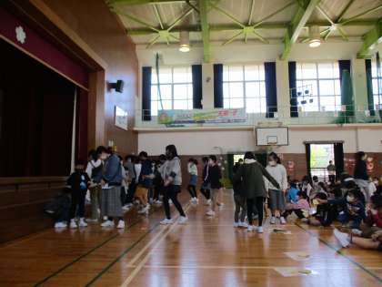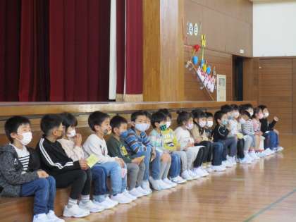今日は、入学おめでとう集会。1年生は、朝からどきどきわくわくしていました。集会では、初めて出会うファミリー班のお兄さんお姉さんにやさしく接してもらい、とっても嬉しそうにしていました。ステージから初めてファミリー班のところへ連れて行ってもらうときは緊張した面持ちだったのですが、退場の際に再びファミリー班へ行くときは、笑顔一杯で安心した表情をしていました。ファミリー班でのゲームなどの交流が楽しかったことが伝わってきました。