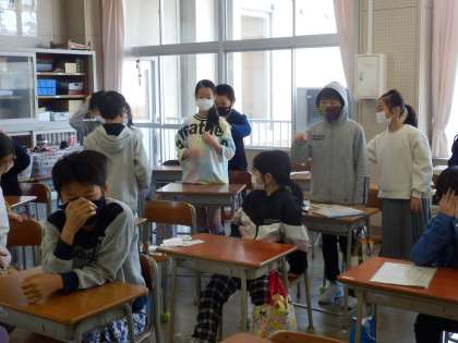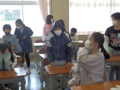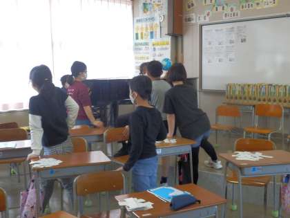 今日の入学おめでとう集会では、ゲームをすることになっています。その一つに、伝言ゲームというのがあり、下学年が困っていたら助けられるように、どんなゲームかお題を変えてやってみました。指で背中に文字を書き、書かれた人はまた次の人の背中に書いて伝えていくゲームです。やってみると意外に難しいという事が判明。みんなが楽しくできるように、5年生として声をかけていこうという話をしました。