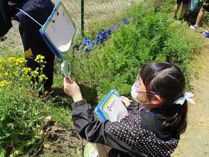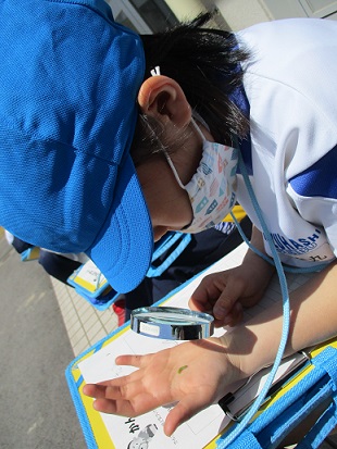 今日は、初めて虫眼鏡を使って、植物や虫を観察しました。