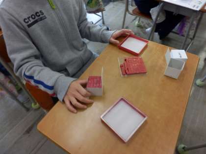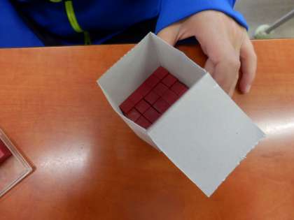 体積についての学習です。1立方センチメートルを敷き詰めて、いくつ入るかで表します。「隙間なく」がポイントです。1辺が5センチの立方体には125個入りました。計算で求めることもできます。