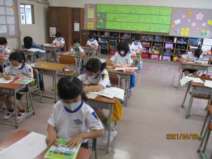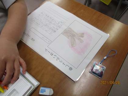 国語の時間に、自分の見つけた春の生き物や植物をカードに書きました。いつ、どこで、そのときに自分が何を思ったのかをわかりやすくまとめることができました。黙々と集中して活動に取り組み、色を使って綺麗な絵も描きました。