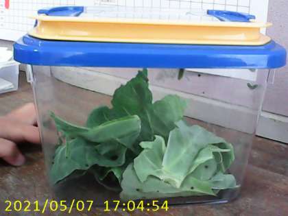 はたけにいたあお虫を生き物がかりやむしが好きな人がそだてています。