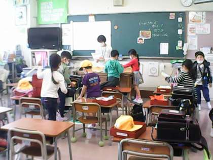 登校後6年生は、1年生のお手伝いに行っています。今日は、私が当番の日でした。マスクをしっかりと着けて、距離を取ることも意識しながらお手伝いしています。