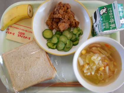 今日の献立は、食パン、牛乳、チリコンカン、きゅうりもみ、キャベツスープ、スライスチーズ、バナナです。明日の献立は、ご飯、オレンジジュース、いかのかりん揚げ、もやしのおひたし、豚肉と大根のごま味噌煮です。