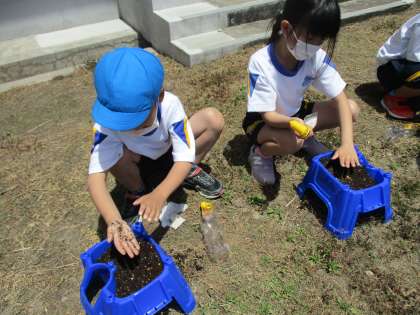 今日は、あさがおのたねをじっくりと観察して、植えました。そうっと土をかぶせたり、「早く大きくなってね」と優しく声をかけながら水をやったりしました。