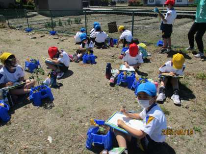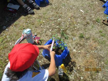 野菜の観察をしました 公開日 2021/05/14 更新日 2021/05/14 2年生 5月10日に野菜の苗を植えました。2年生は登校してきたとき、下校するときに水やりをがんばっています。生活科の時間では、野菜の大きさや高さ、色、形、触った感じ等に注目しながら観察をしました。ものさしを使って、高さや大きさを調べている子供たちが何人かいました。これから成長の記録をカードに書き続けて、観察名人を目指します!