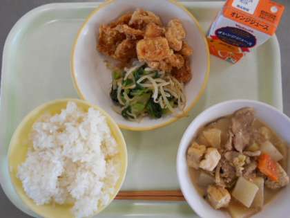 今日の献立は、ご飯、オレンジジュース、いかのかりん揚げ、もやしのおひたし、豚肉と大根のごま味噌煮です。来週火曜日の献立は、ご飯、牛乳、チンズワンズ、よごし、海老と豆腐の旨煮です。
